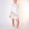 Long sleeve white top with asymmetric neckline and hem and flared sleeves. Side panel with top stitch detail.