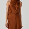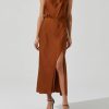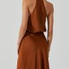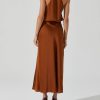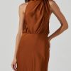 A midi dress so versatile, your options for wearing it are endless.Introducing the Jelyn Satin Midi Dress by ASTR, a stunning piece in a rich bronze hue. This sleeveless sheath dress is crafted from luxurious polyester for a sleek and smooth finish. It features a sophisticated mockneck and is designed with a convenient button closure. For optimal care, dry clean only to maintain its pristine condition.