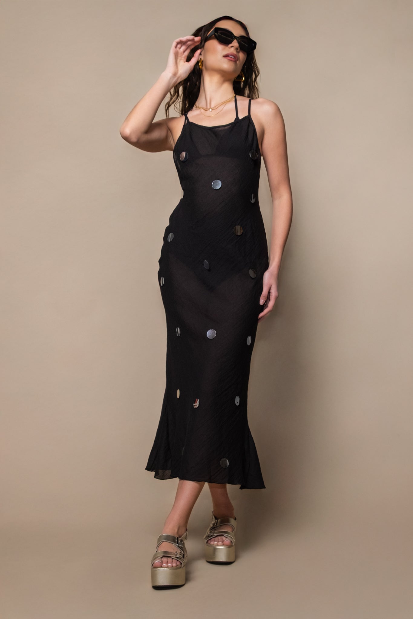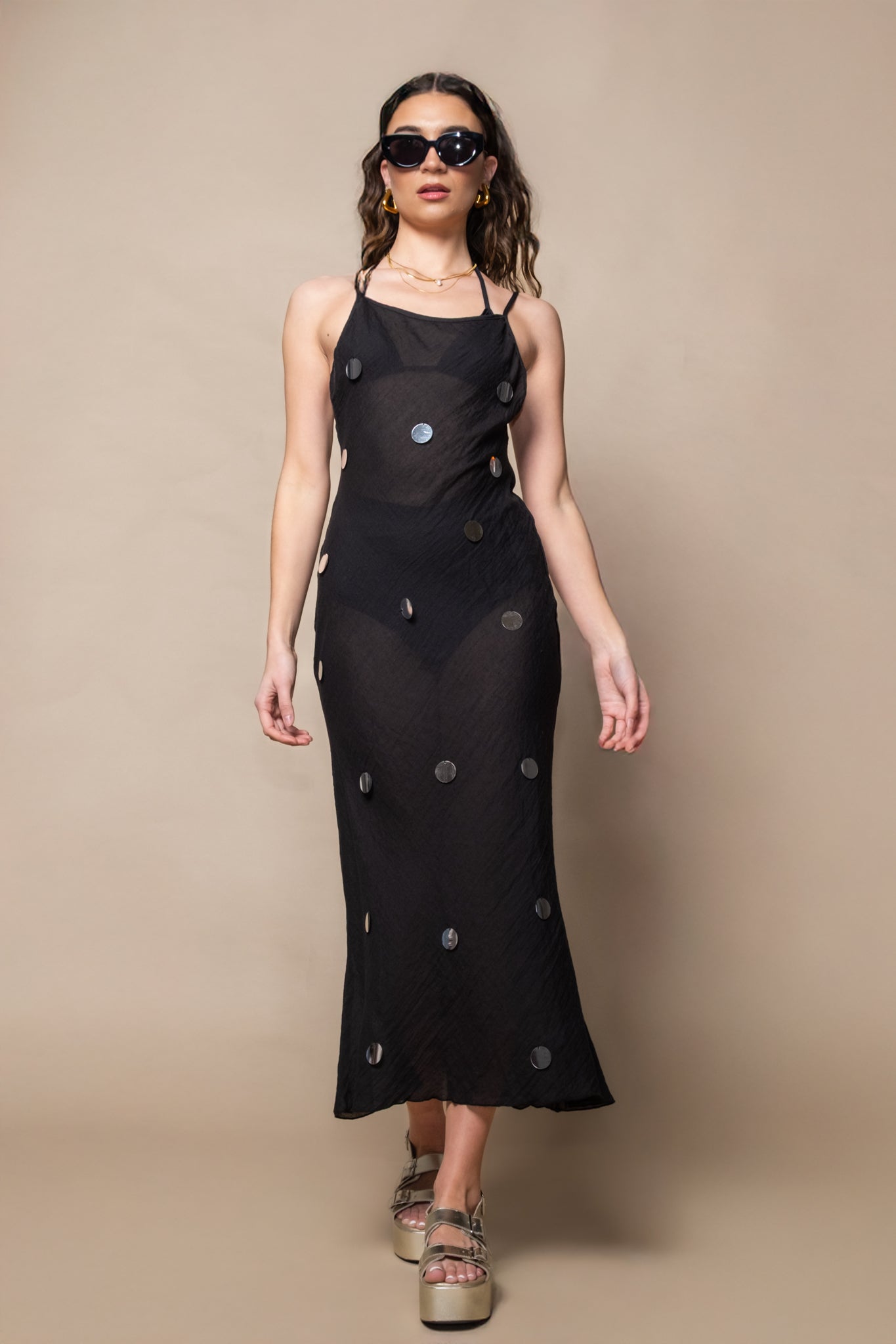 This sleek, slip-style dress features shimmering iridescent pailettes scattered across the front, adding a touch of sparkle to your beach or poolside look. With adjustable straps for a customizable fit, this coverup offers both comfort and style. Whether you’re strolling the shoreline or lounging by the pool, the Luna Slip Dress is sure to turn heads!