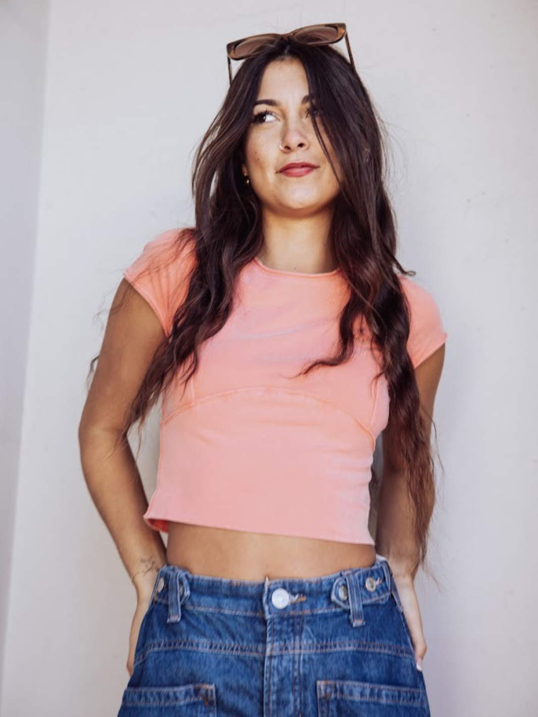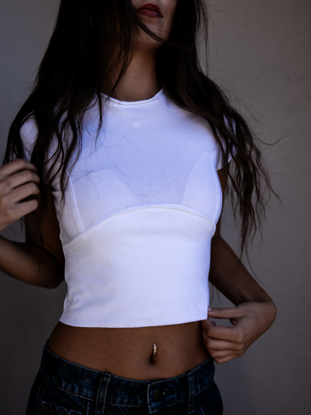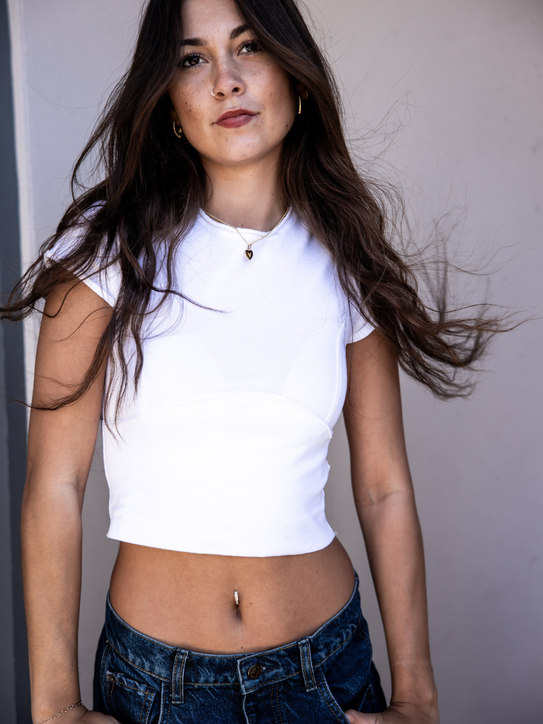 The most effortless way to take your tee collection to the next level, this vintage-inspired version is featured in a cropped silhouette with exaggerated seaming, slightly capped sleeves, and tapered bottom detail for added shape.
