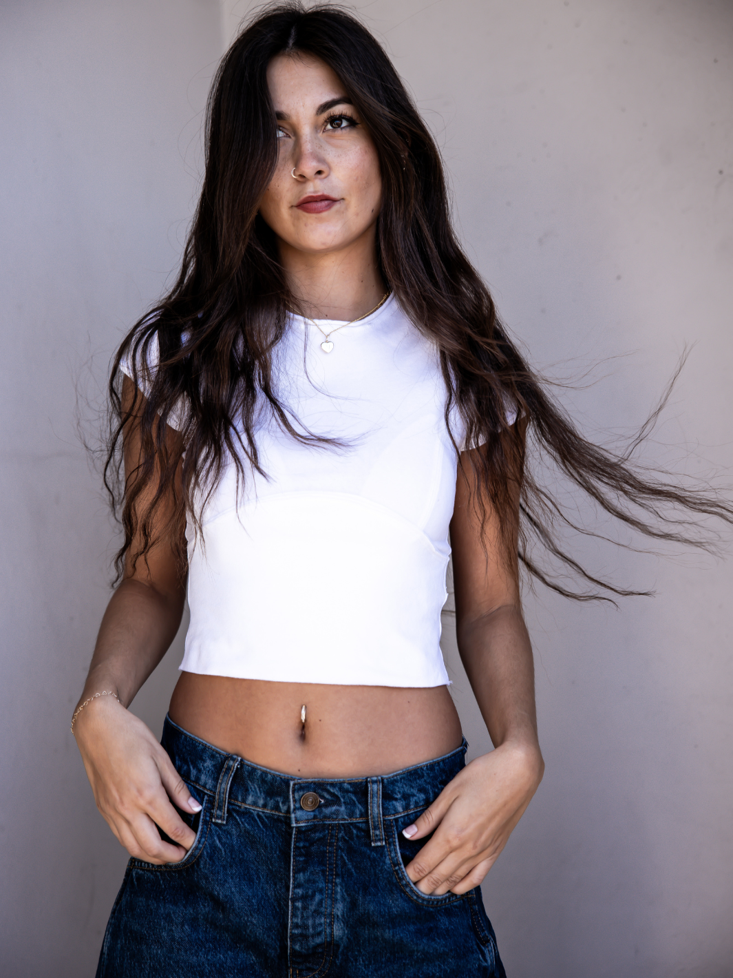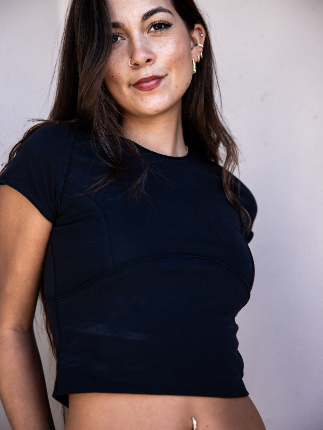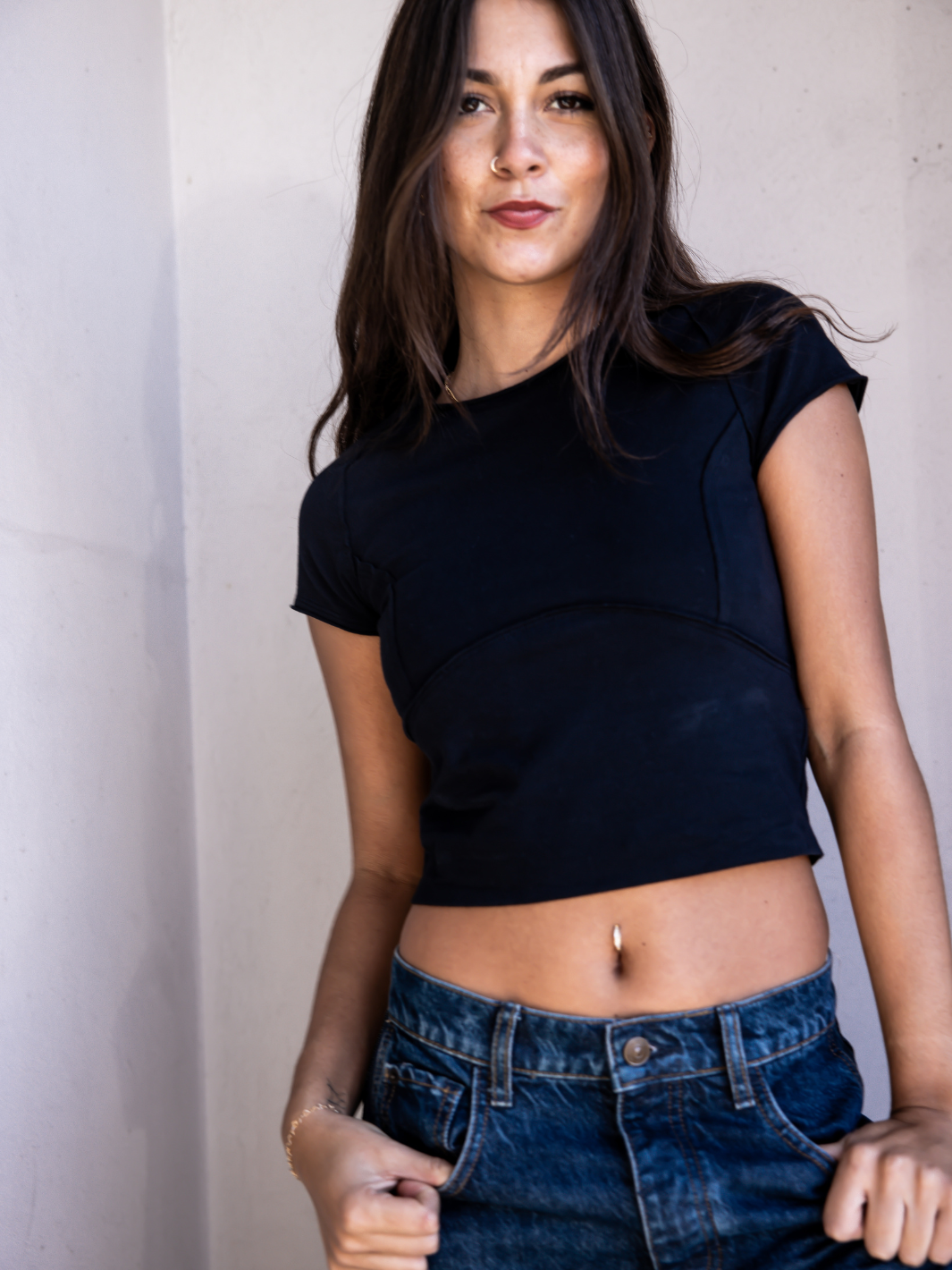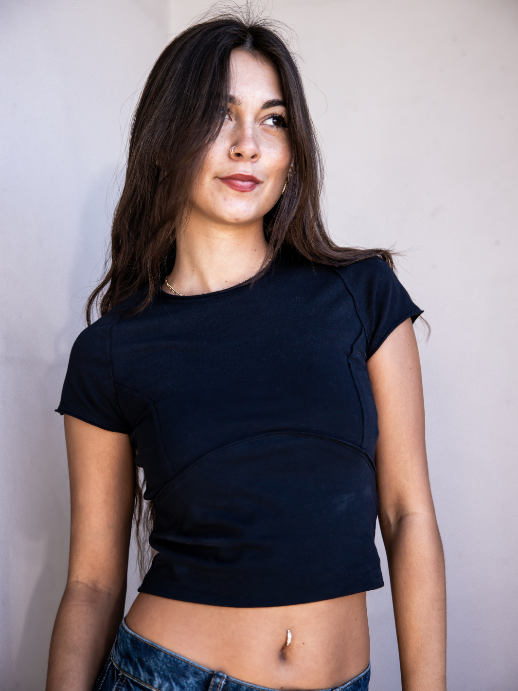 The most effortless way to take your tee collection to the next level, this vintage-inspired version is featured in a cropped silhouette with exaggerated seaming, slightly capped sleeves, and tapered bottom detail for added shape.