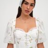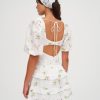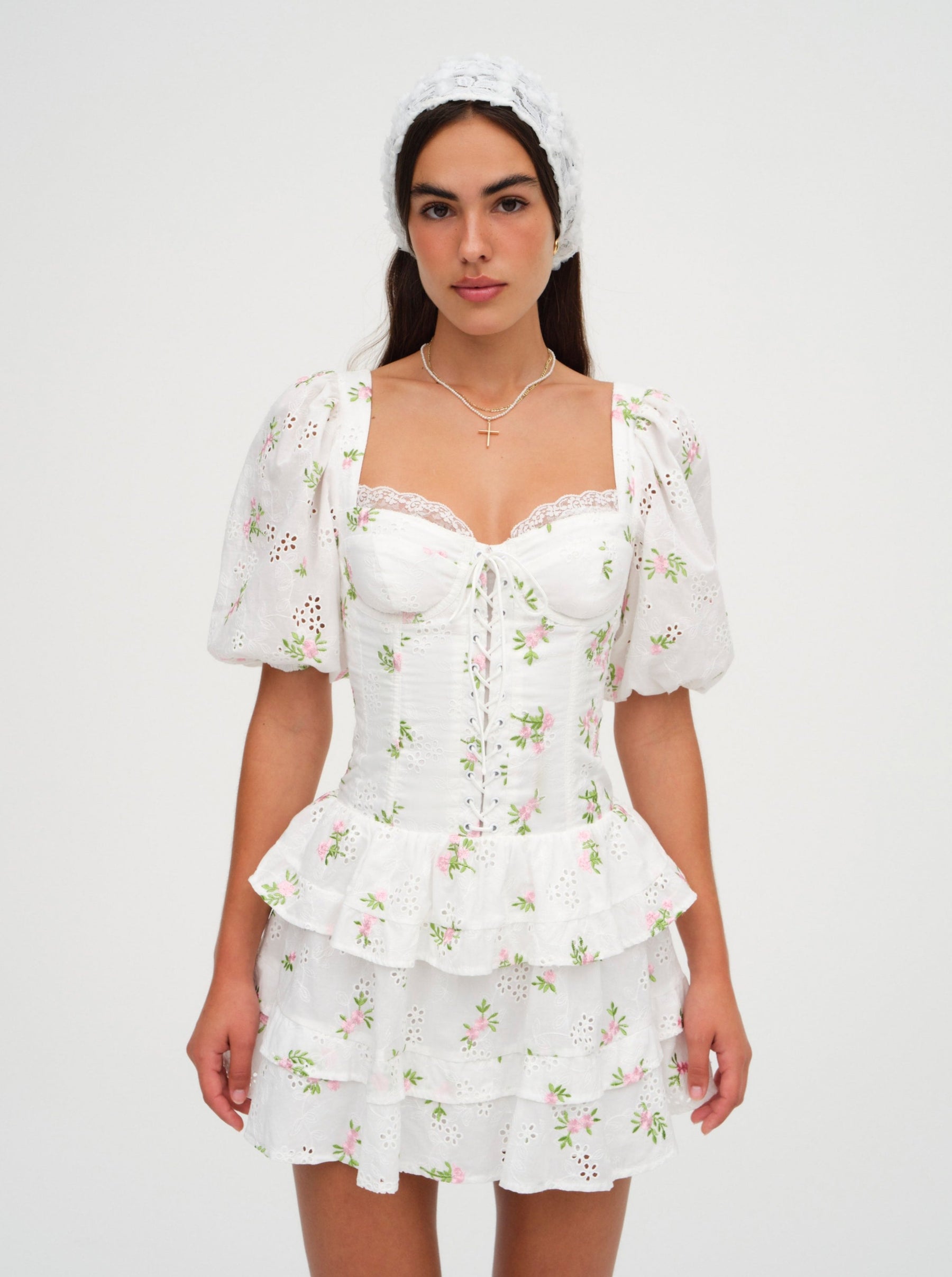 The Kinsley mini corset dress–a white dress with romantic puff sleeves and functional lace up detailing at the bodice. Made from a pink rosebud eyelet fabric—this puff sleeve dress amps up the charm with a low-waisted ruffle tiered skirt.