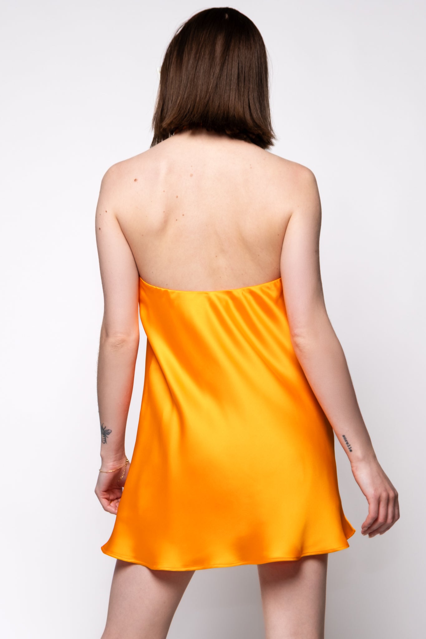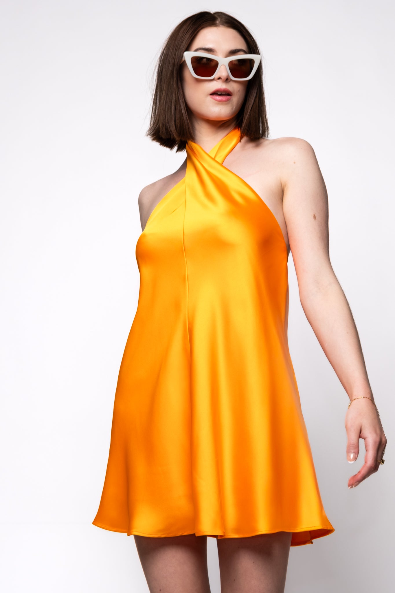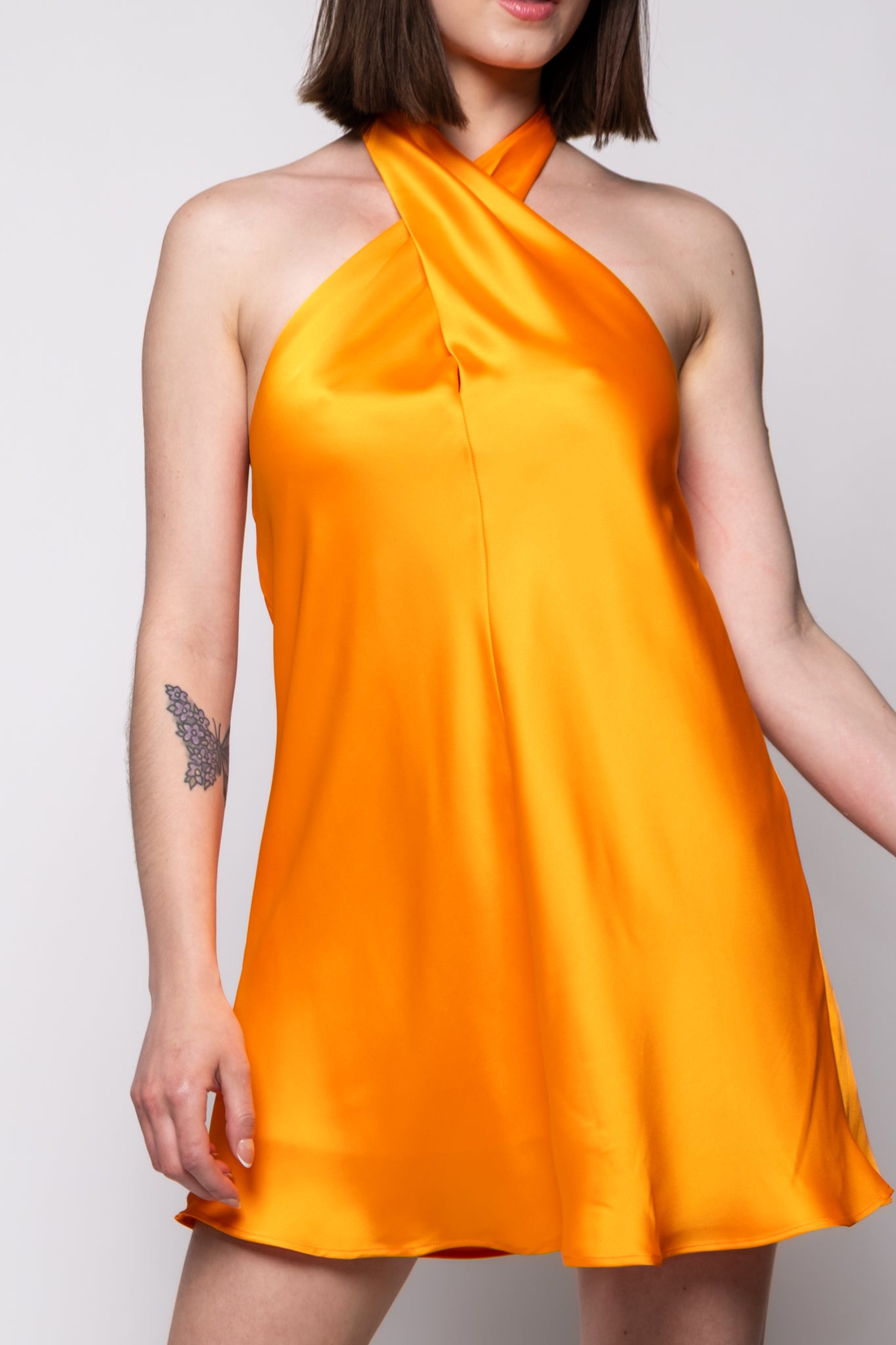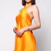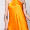 A bold orange satin mini with a twisted halter neck and a flowy, flattering fit. Perfect for making a statement.