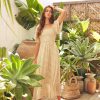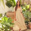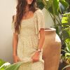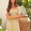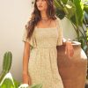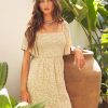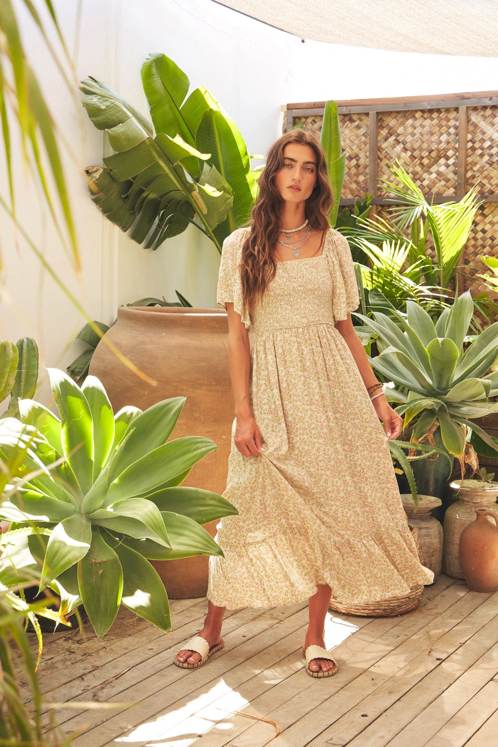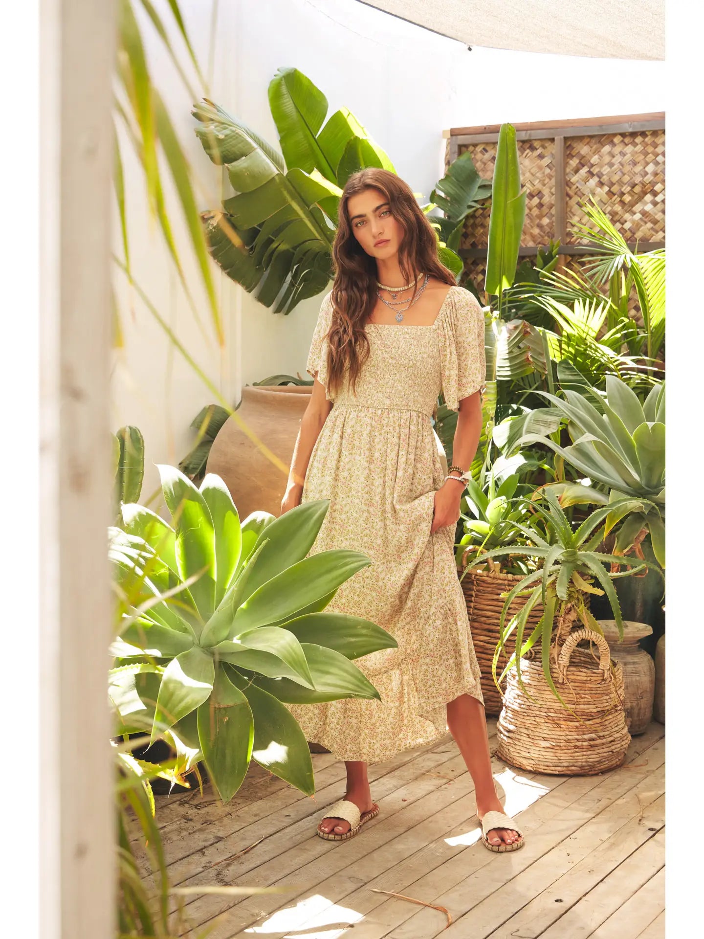 Flowy midi dress featured in a breathable airy rayon gauze fabrication and floral print with square neck, full lining, pockets, and smocked bust.