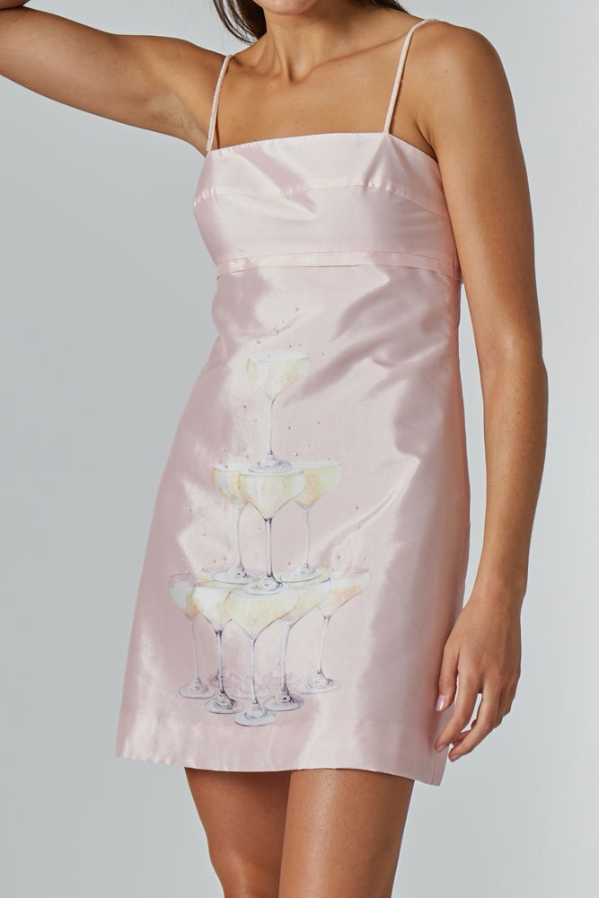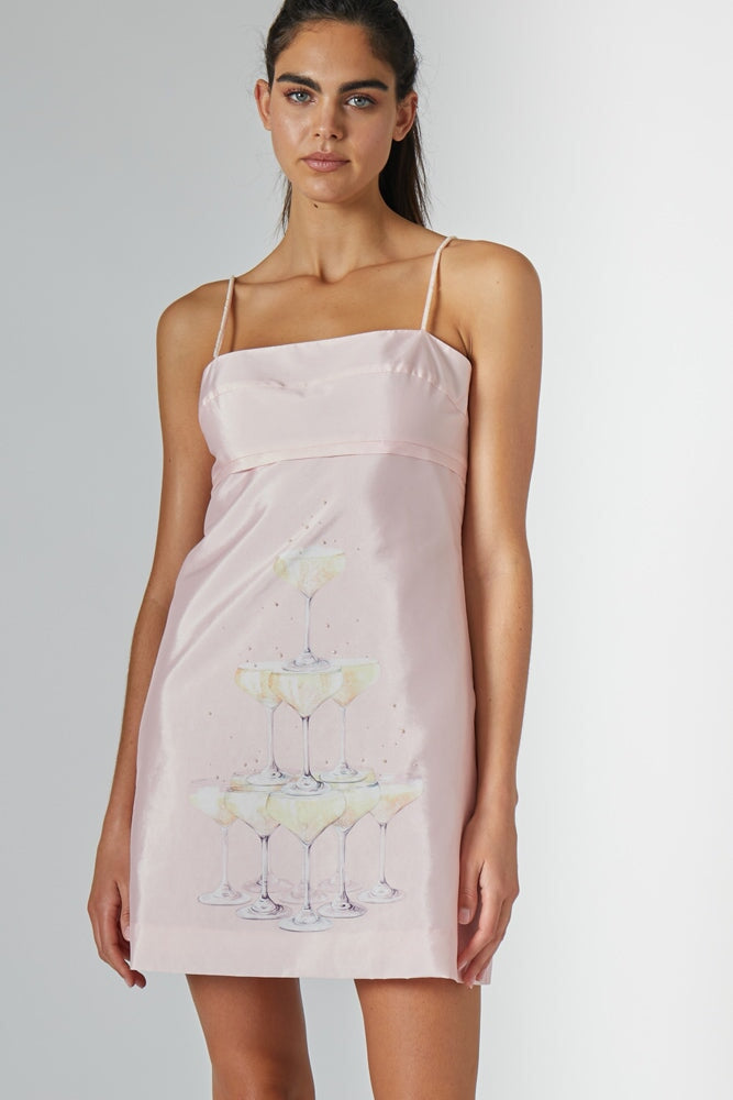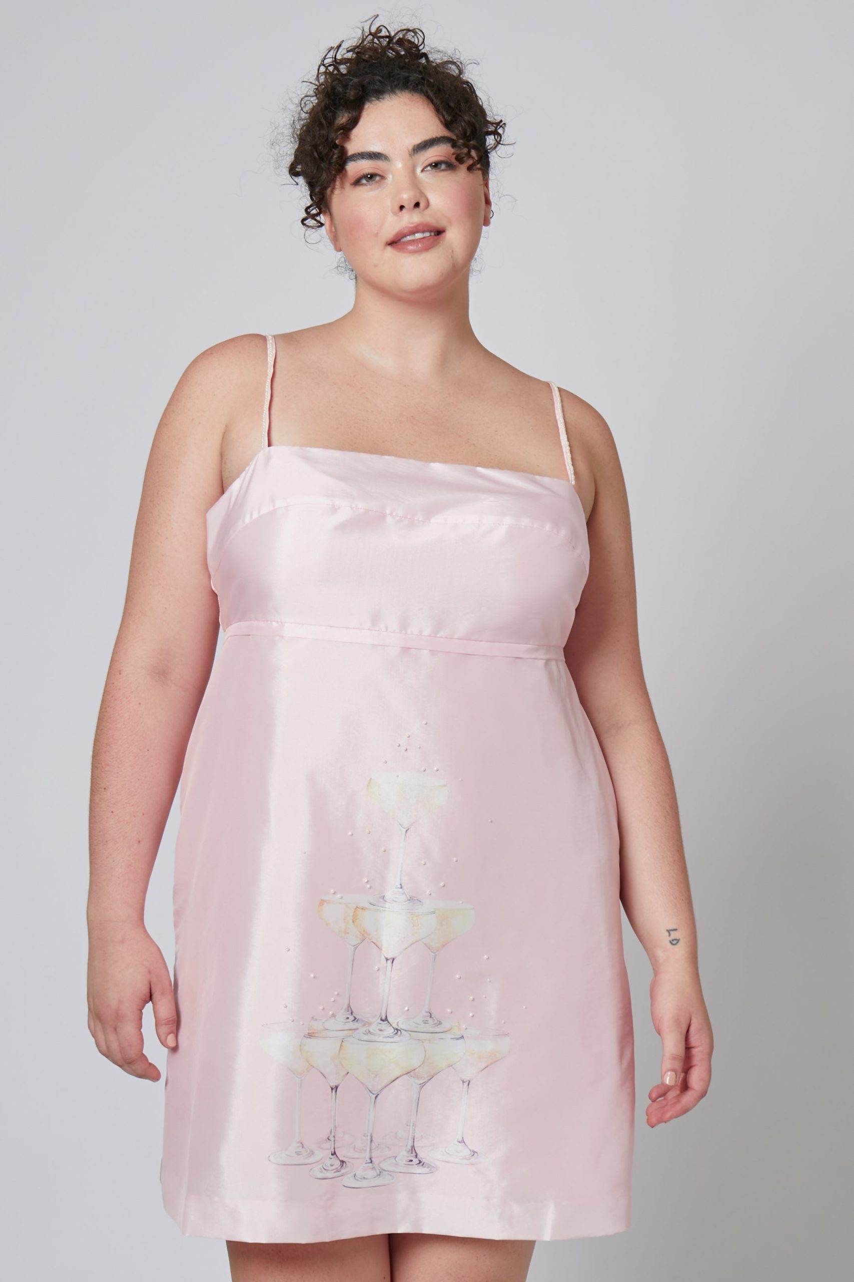 – A-line mini shift dress with adjustable beaded spaghetti straps– Very fitted at the bust and straight through the hips– Pleat detail at waist– Invisible side zip closure– 100% Polyester Taffeta– Fully lined– ‘Champagne Tower’ artwork placed at front body with beaded details– Original print artwork by Hazel Lee Santino– Runs small, size up if between sizes– Mieke is 5’11” wearing a size 4– Grace is 5’11” wearing a size 14 -