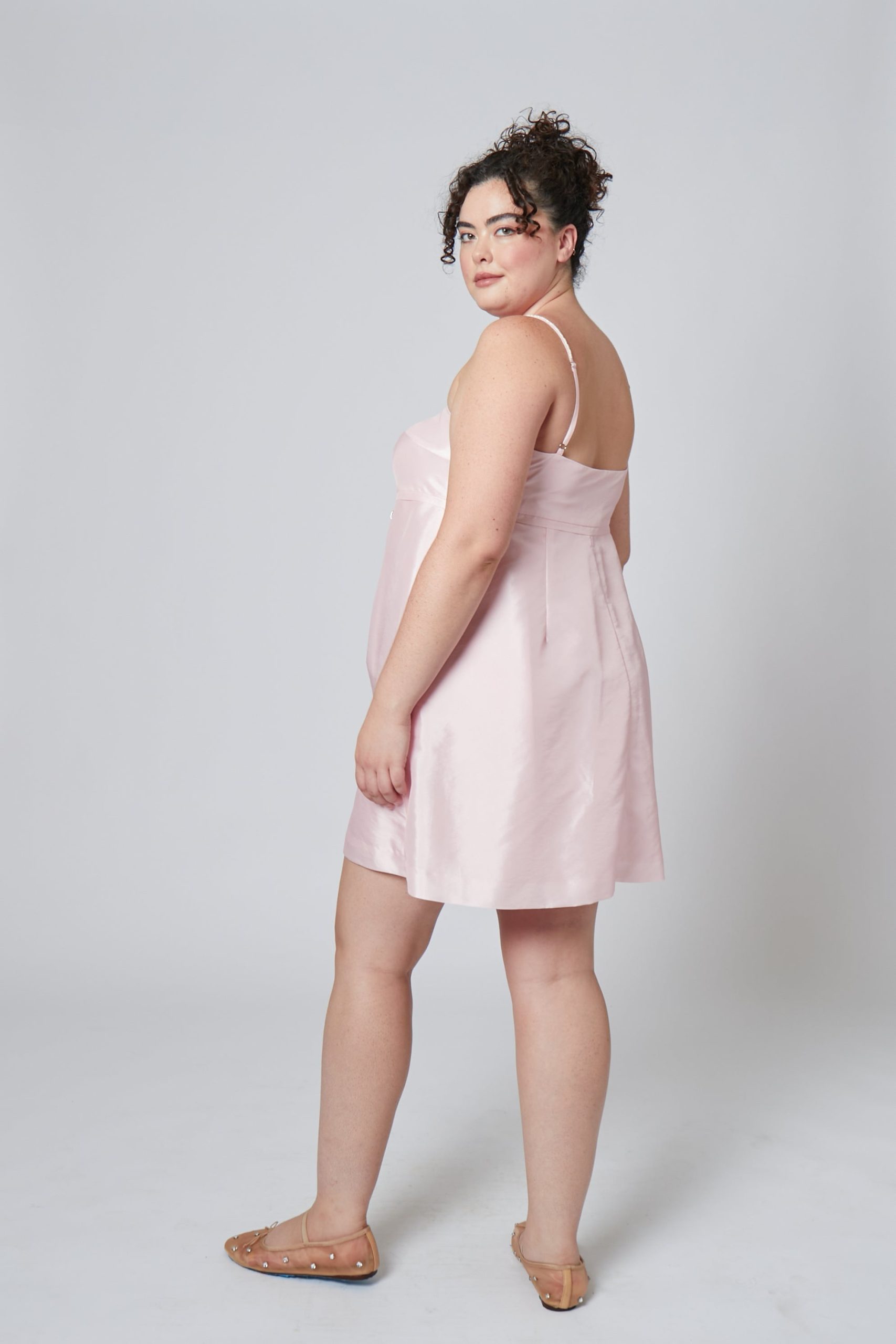 Understated glamour is nice. Glamour so unrestrained it borders on camp? Divine! This elusive combination of class and spectacle is perfectly encapsulated in the effervescent danger of a champagne tower, and so we perfectly encapsulated the champagne tower on our newest Gwen. Bubbly opalescent beads float across a festive still life of stacked coups, coming to rest on the adjustable straps, while a pleated bust, A-line silhouette, and subtly shiny ballet pink taffeta balance the sweet with chic. Pair with a metallic platform and a tiny clutch, then head to your frenemy’s NYE party and divert attention from her all night long!