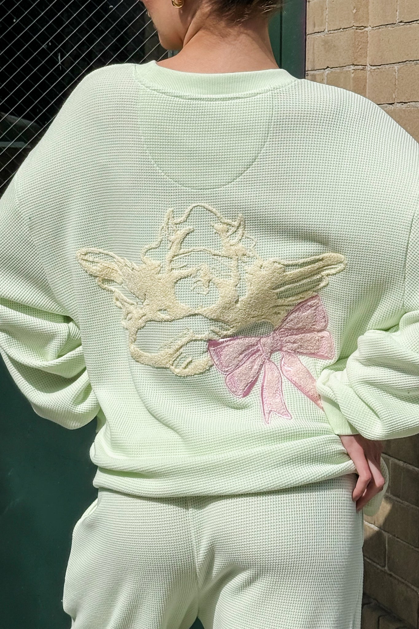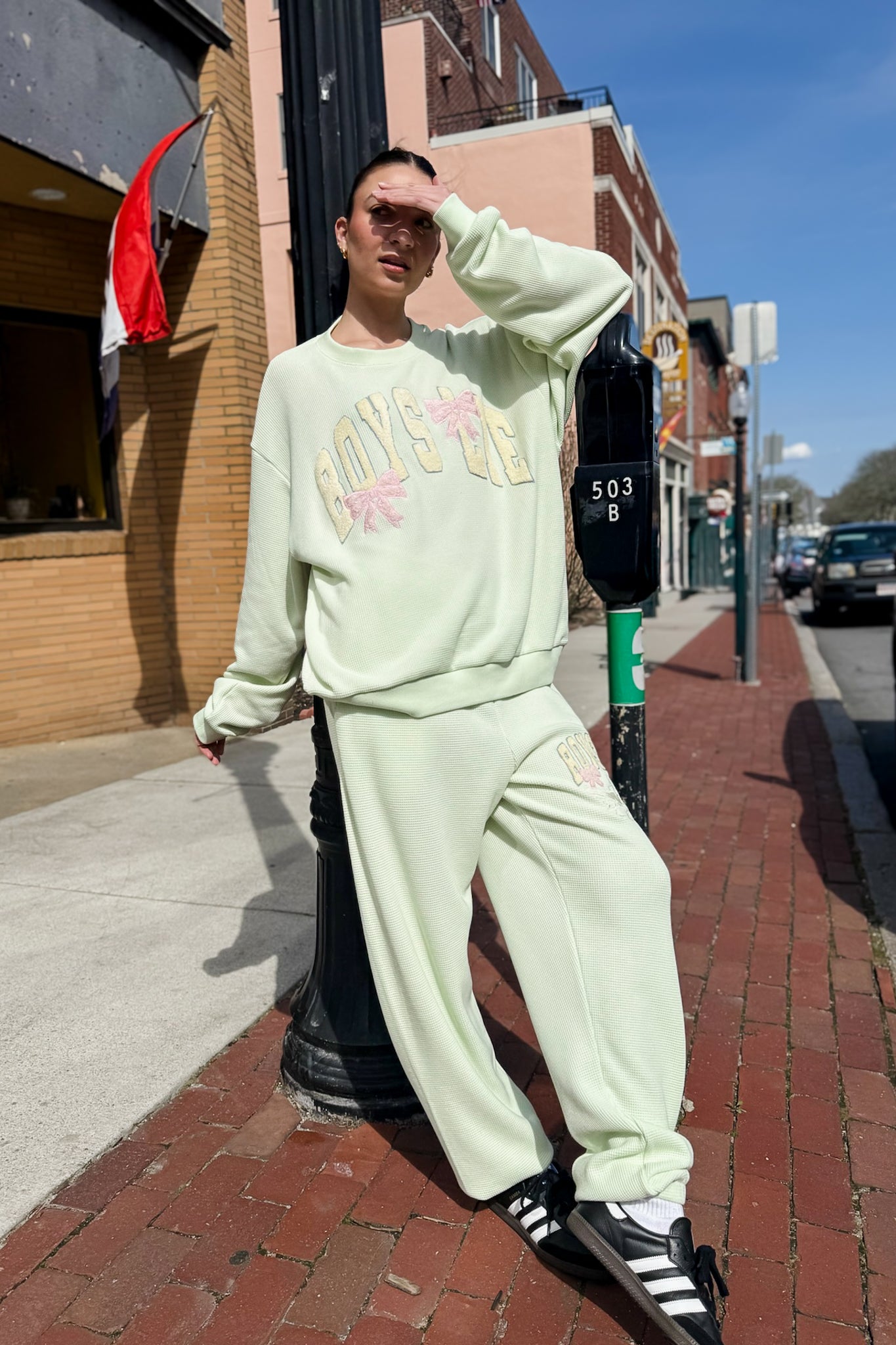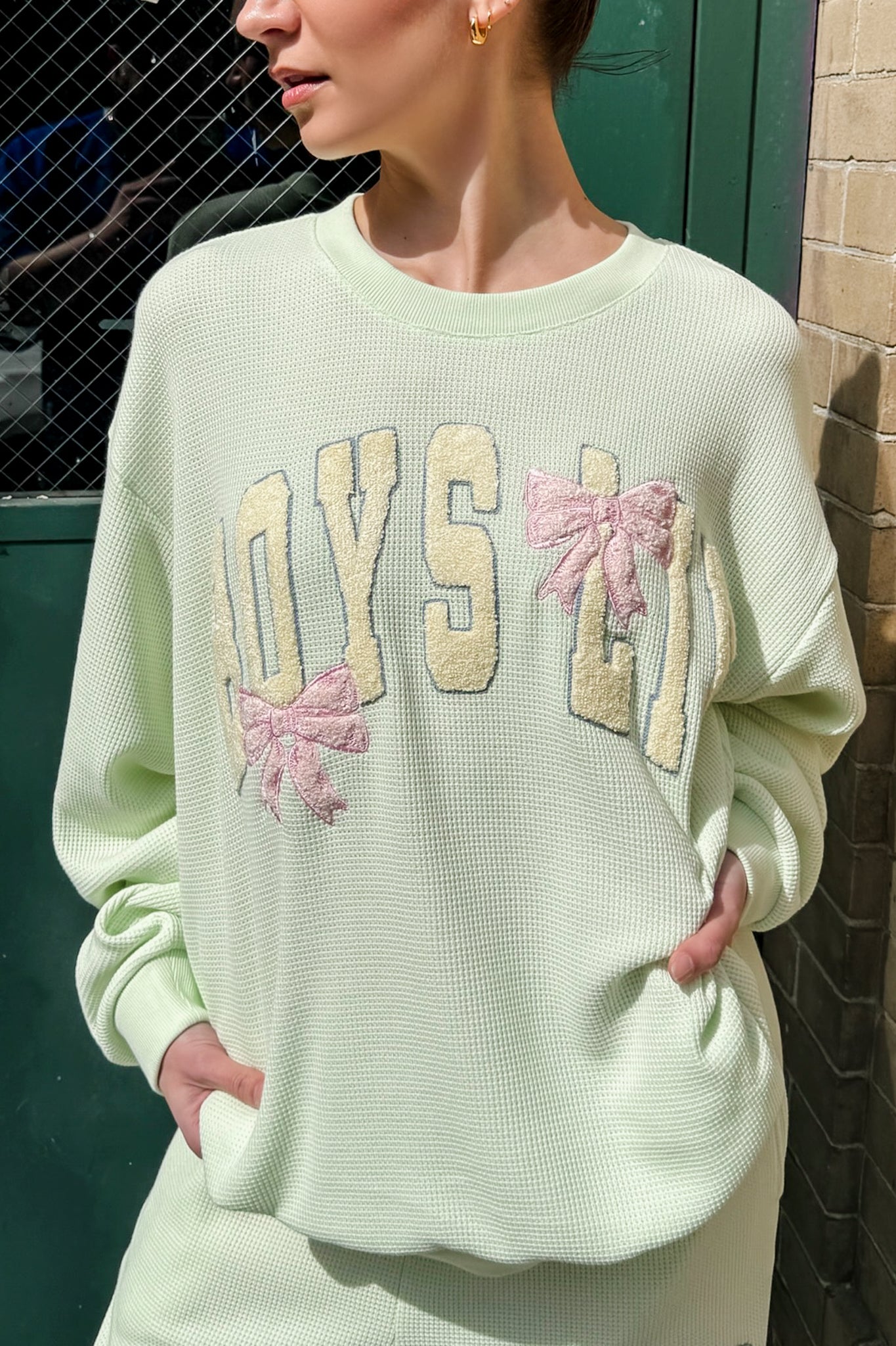 Made from soft, lightweight thermal fabric, this relaxed-fit crewneck is perfect for layering or wearing solo. The plush chenille Boys Lie lettering on the front, paired with delicate pink bow details, adds a touch of girlie vibes. Whether you’re dressing it up for a casual outing or throwing it on for a breezy beach night, this crewneck is designed to keep you feeling as good as you look!