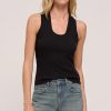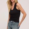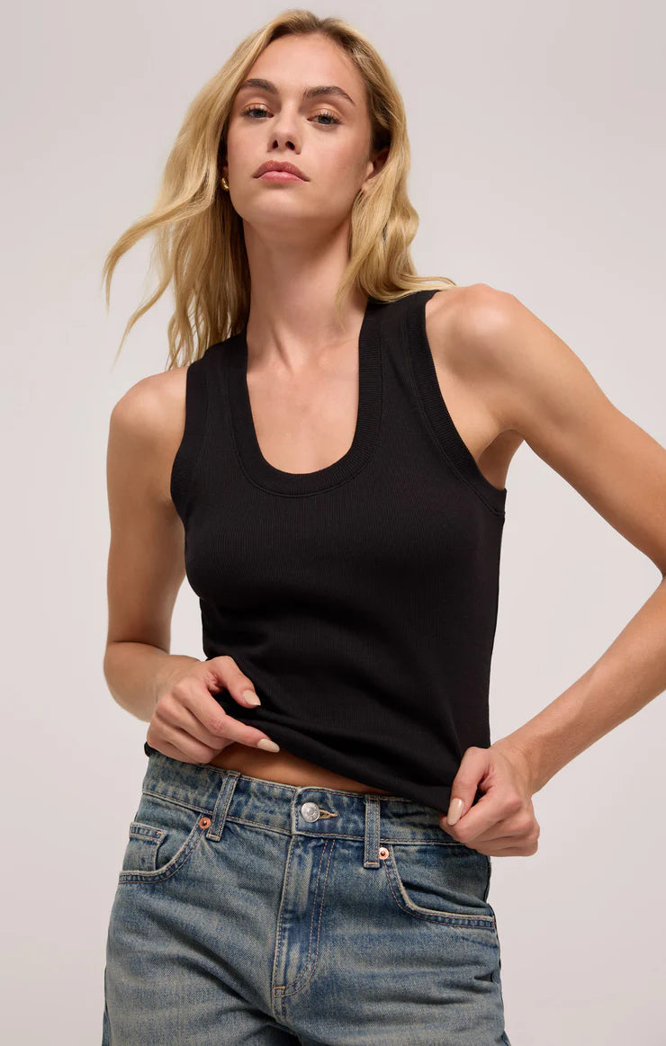 One of our most popular Essential tanks, made of our softly textured feather rib fabric, is a must-have whether worn on its own or as a fitted layer. We love this basic bra-friendly tank tucked or untucked.
