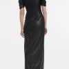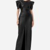 The Toby is a black vegan leather maxi dress made for the cool girls. High fashion and edgy, this gown has structured shoulders and pleated balloon short sleeves. The long center hem slit gives this statement piece a sleek and flirty touch. This gown is guaranteed to liven up any boring gala or black tie wedding.