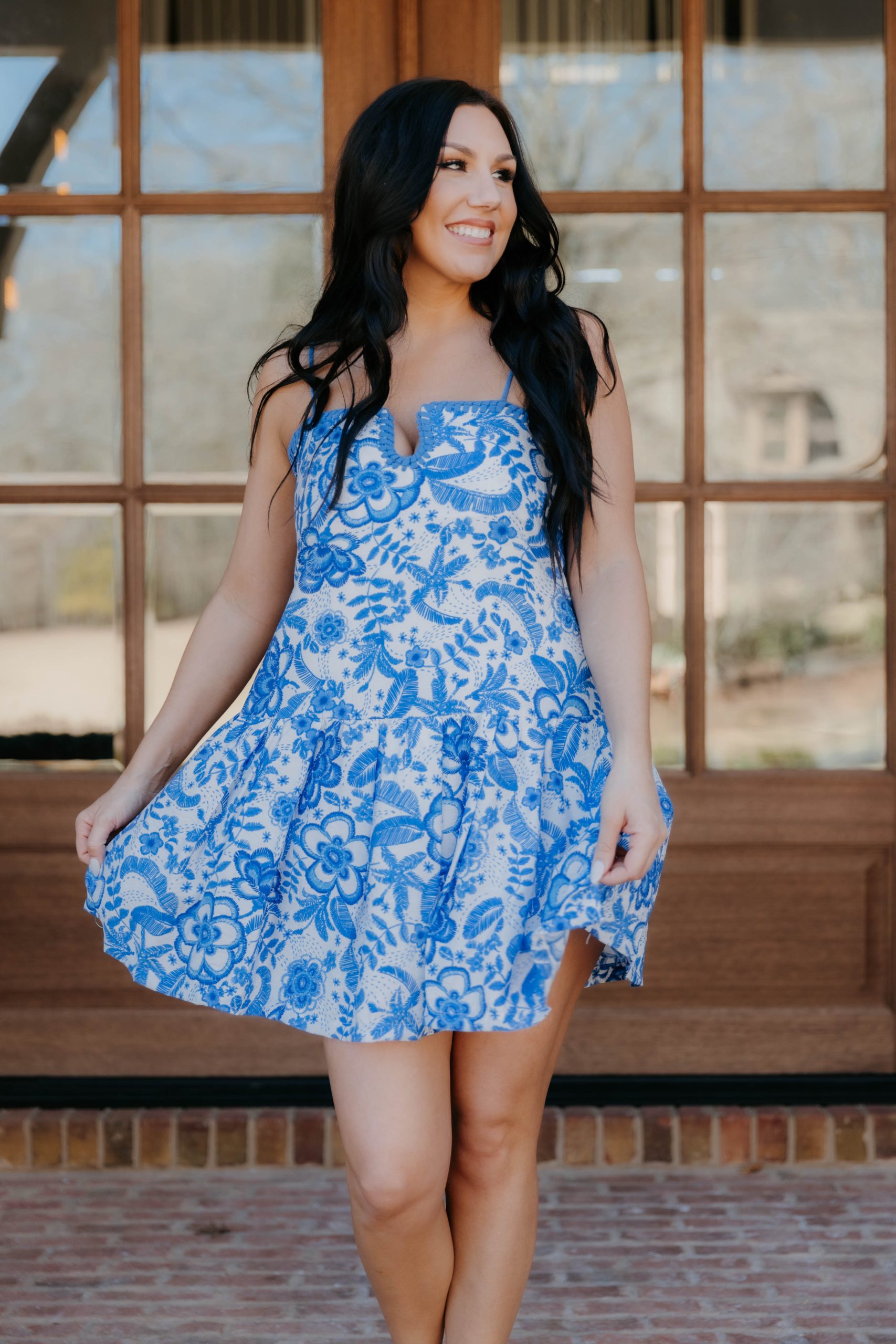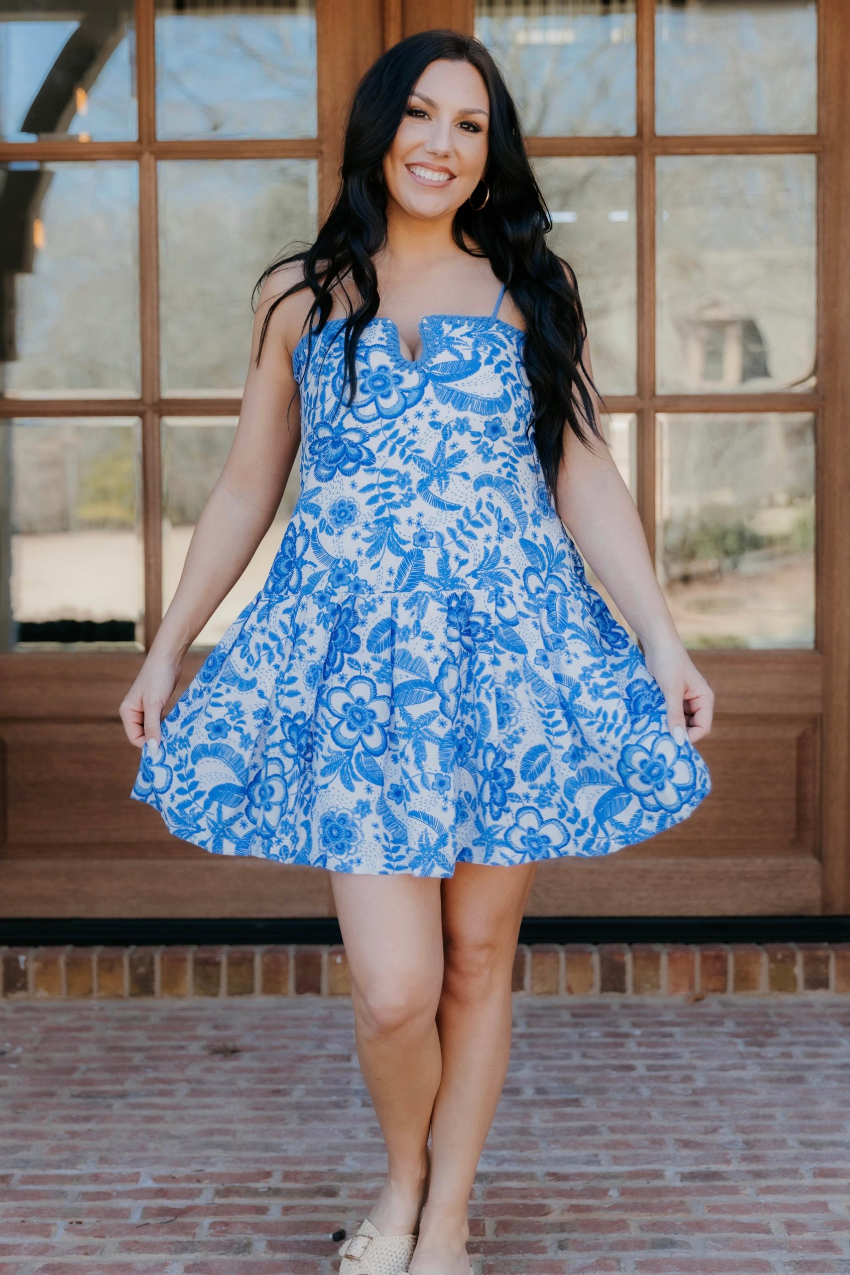 Faux embroidered floral printed dress with contrast stitch detailing along the neckline and a dropped waist. It features a hidden rear zipper and is fully lined.