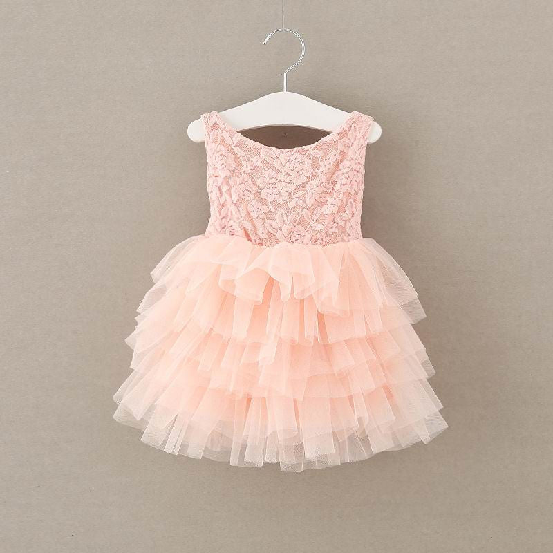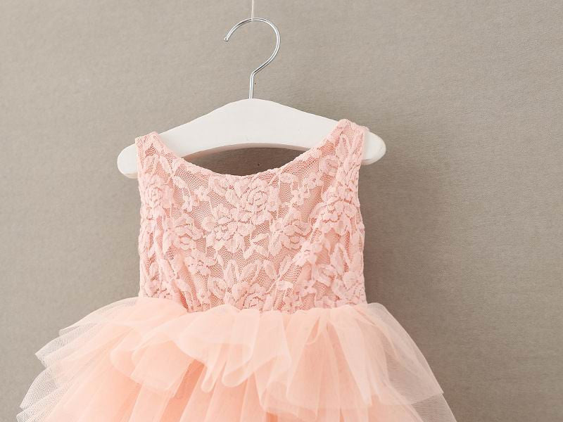 Soft stretch lace bodice which is see-through lace at the back and fully lined at the front. Tie up ribbon sleeves. Layers and layers of soft tulle skirt for extra fullness.