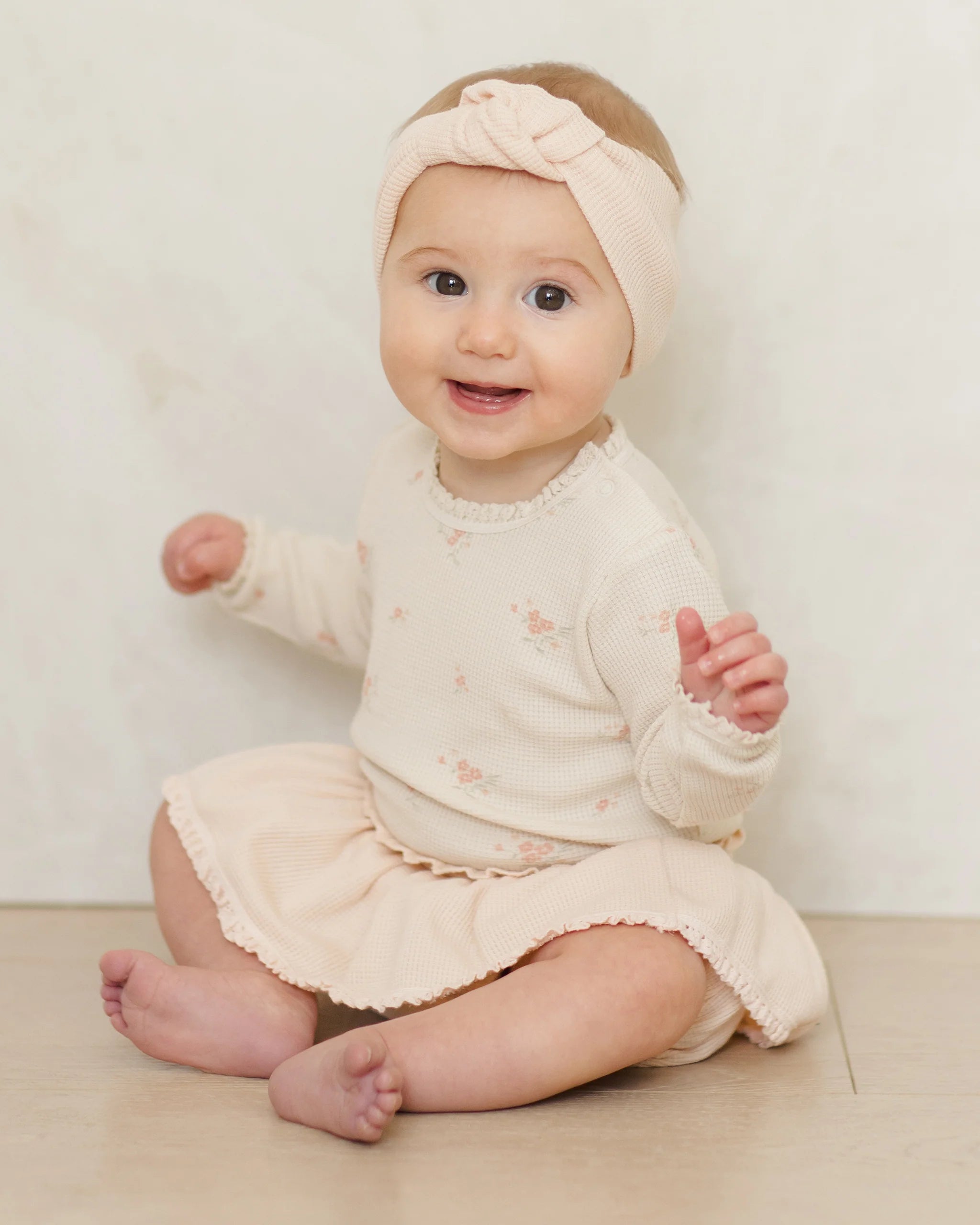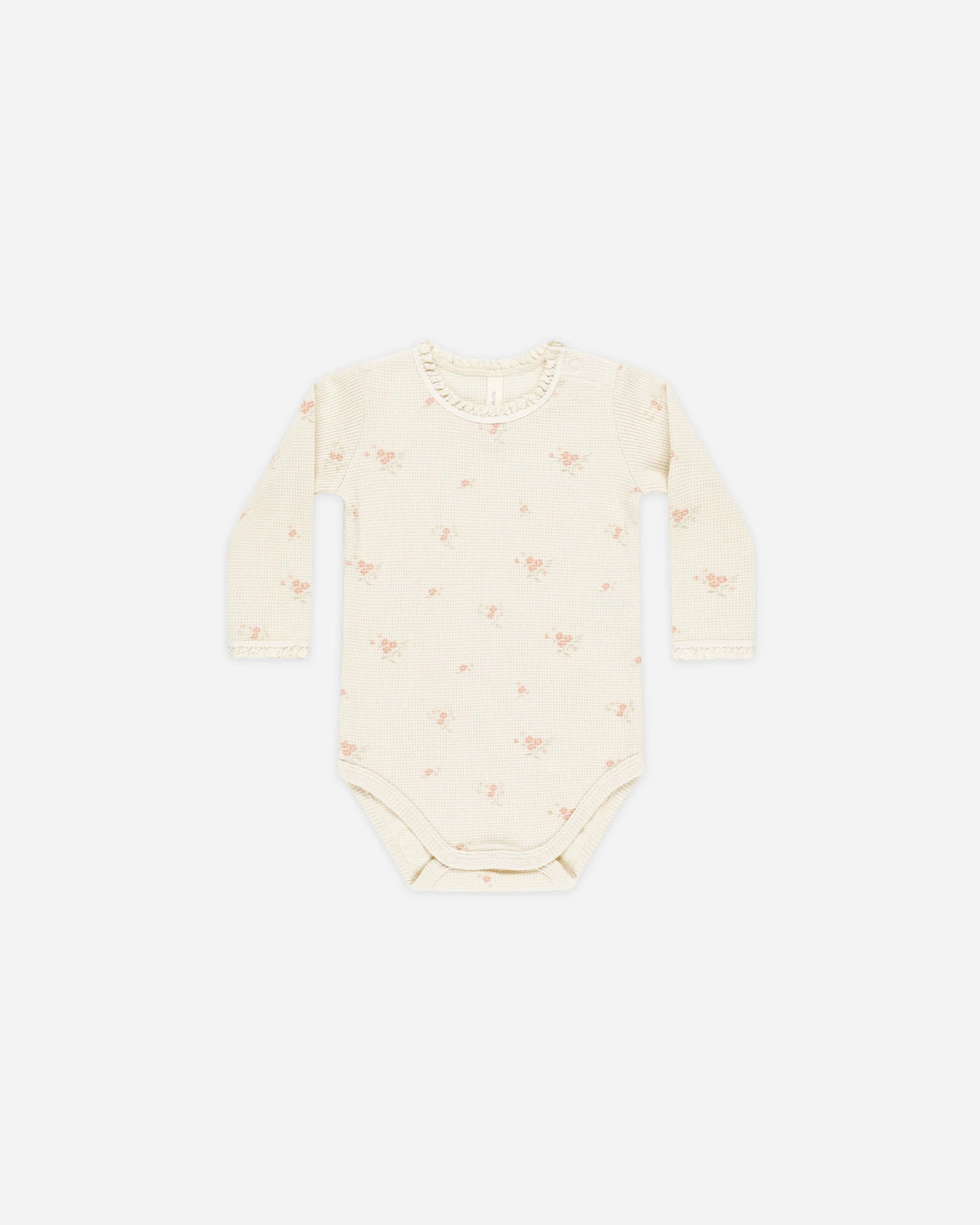 Long sleeve onesie in our lightweight waffle knit. Designed with shoulder and bottom snaps for easy changes and the sweetest crochet lace ruffle detail.