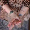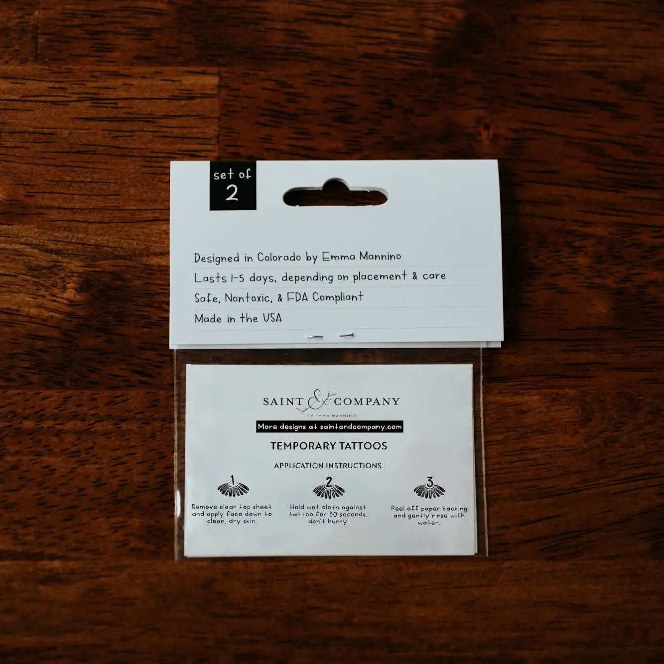 Application Directions: Place the tattoo face down on skin. Apply even pressure to the tattoo paper backing using a wet cloth. Wait a minimum of 60 seconds and then remove the cloth and gently slide off the paper. Full Application directions are included in your package.