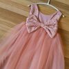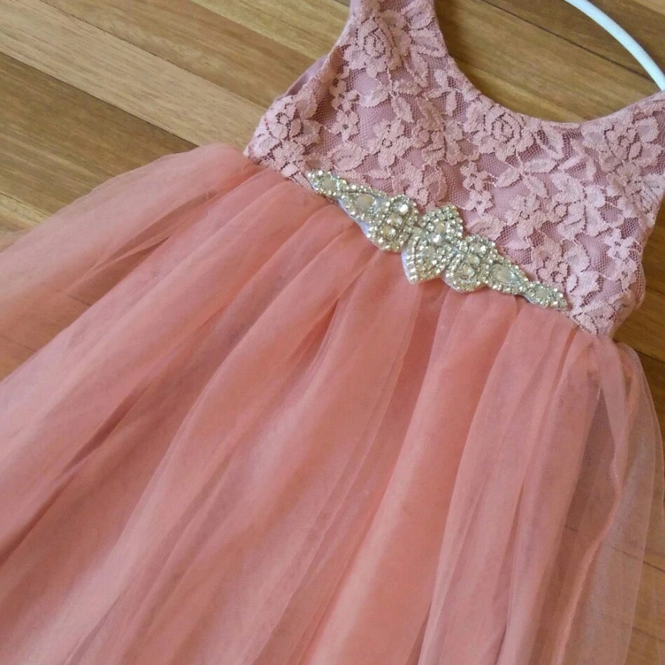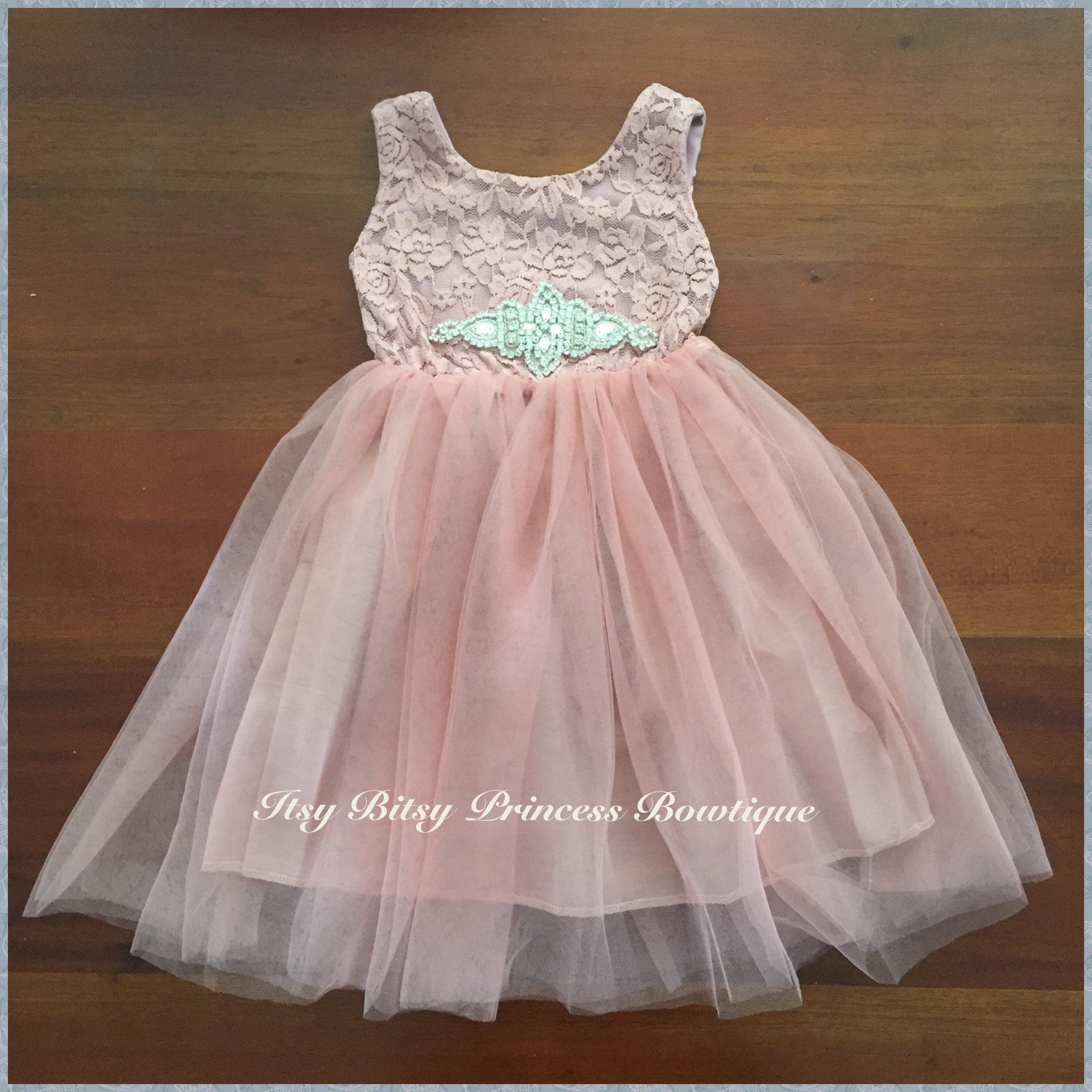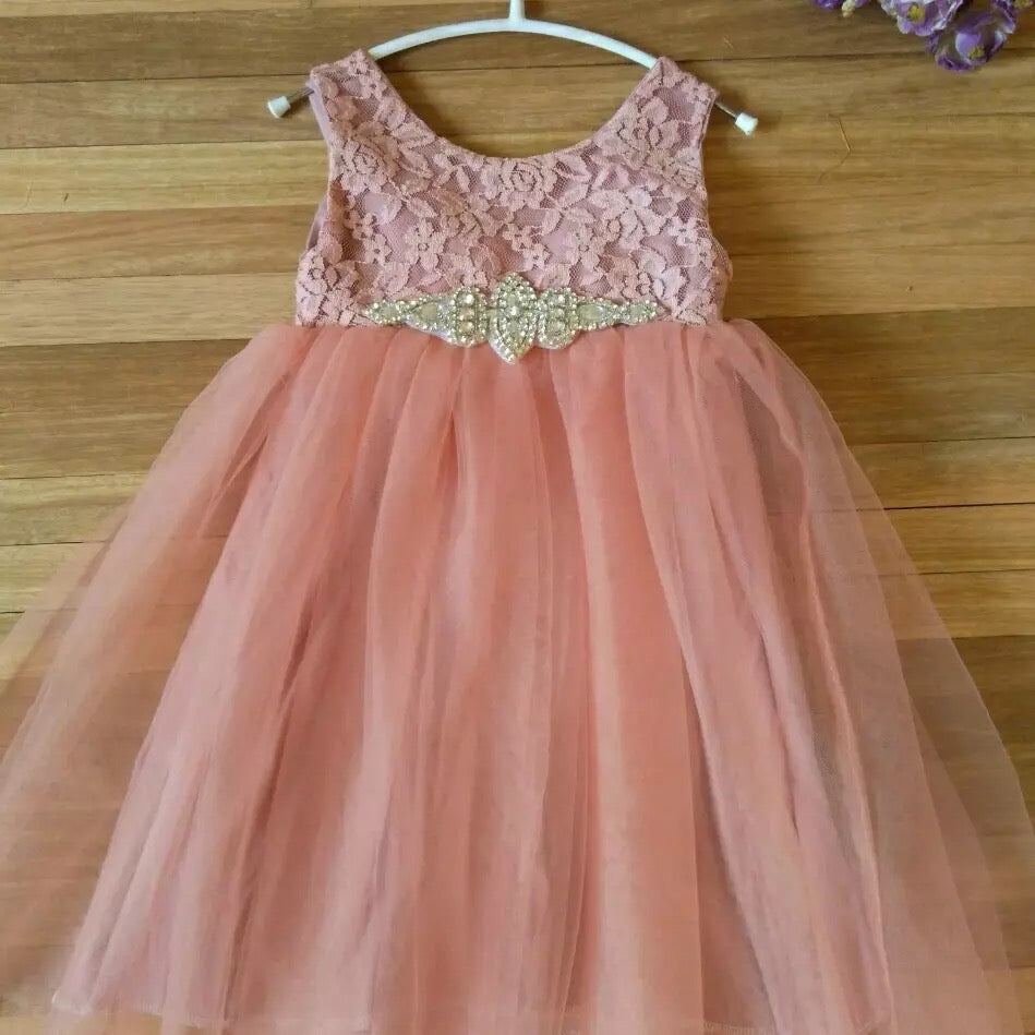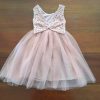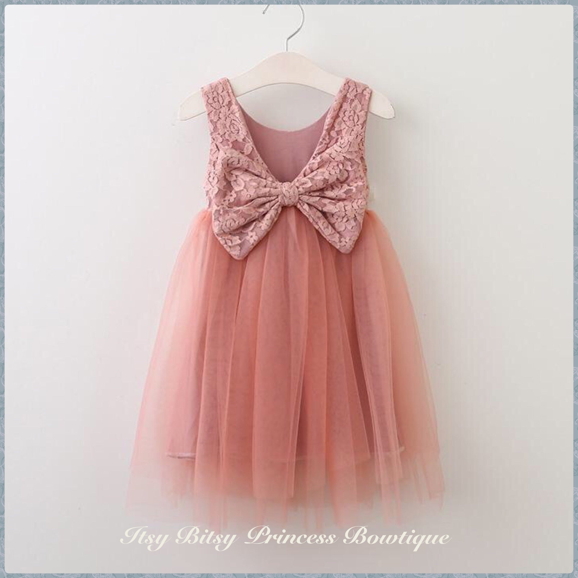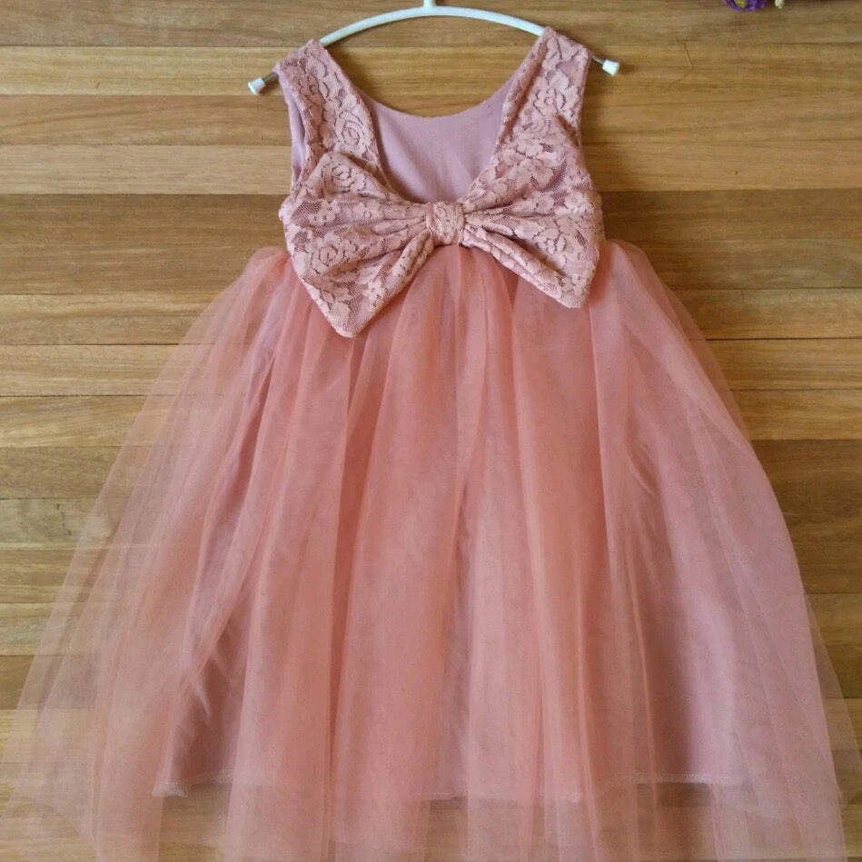Princess inspired feel lace bodice dress with a v cut back and bow with gauze skirt and rhinestone detail on the front in dusty pink colour