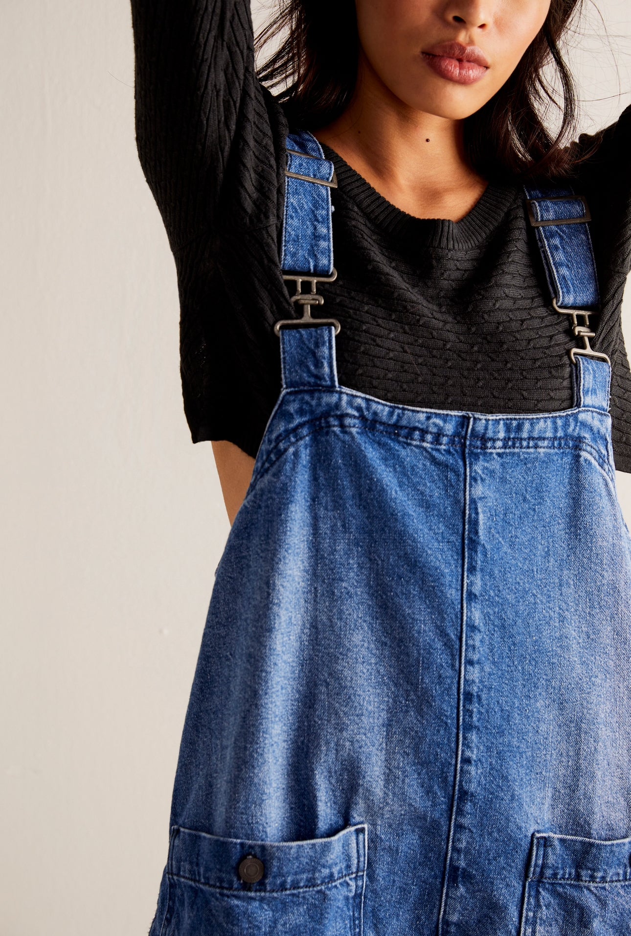 Features: Square neckline, adjustable shoulder straps, front pockets